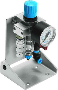 The pressure regulator adjusts the compressed air supplied to the set operating pressure and compensates for pressure fluctuations. The pressure gauge shows the preset pressure. The on/off valve exhausts the entire control.
