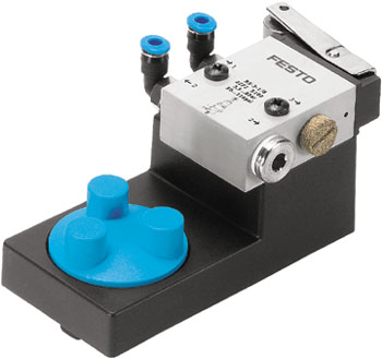 The roller lever valve is operated by pressing on the lever, for example through the use of a switching cam of a cylinder. Connection 1 is shut. After releasing the lever, the valve returns to its initial position through the use of a return spring. The flow may pass through freely from 1 to 2.