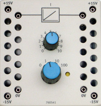The I element is a transfer element used in closed-loop control technology with an integral response characteristic. The input signal/potential at input 1 is summed up over time and results in the output signal/potential at output 2. The speed at which the input signal is integrated can be adjusted with the integral-action coefficient. In order to keep circuit wiring as straightforward as possible, required earthing (0 V) and supply voltage are not led out as terminals, but rather wired internally.