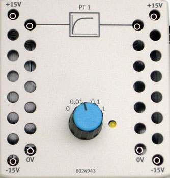 The PT1 element is a first-order proportional delay element used in closed-loop control technology. The input signal/potential at input 1 is amplified or attenuated by proportional-action coefficient Kp and delayed by delay time T, and is read out as the output signal/potential at output 2. In order to keep circuit wiring as straightforward as possible, required earthing (0 V) and supply voltage are not led out as terminals, but rather wired internally.