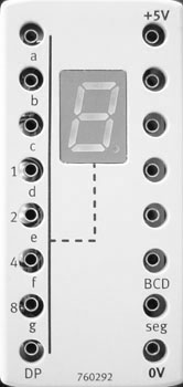 Decimal and hexadecimal numbers can be displayed with the 7-segment display. Depending on the additional inputs available, the individual segments and a decimal point can be controlled separately. The input DP=1 controls the decimal point.